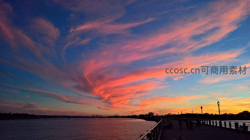 河岸长廊上行人剪影与水面倒影相映,头顶是如火焰般燃烧的粉紫晚霞,构成一幅宁静而浪漫的城市黄昏画卷。