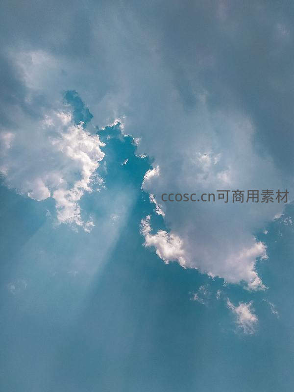 蔚蓝的天空中,厚重的云层裂开缝隙,金色的阳光如利剑般倾泻而下,照亮了云朵的边缘,营造出神圣而宁静的氛围。