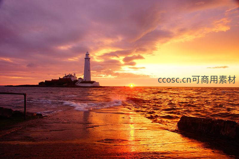 一座洁白的灯塔孤独地伫立在海中小岛上,背景是燃烧般的绚丽晚霞。海浪轻拍着湿润的沙滩,将天空的金色倒影洒满水面,构成一幅诗意的海滨画卷。