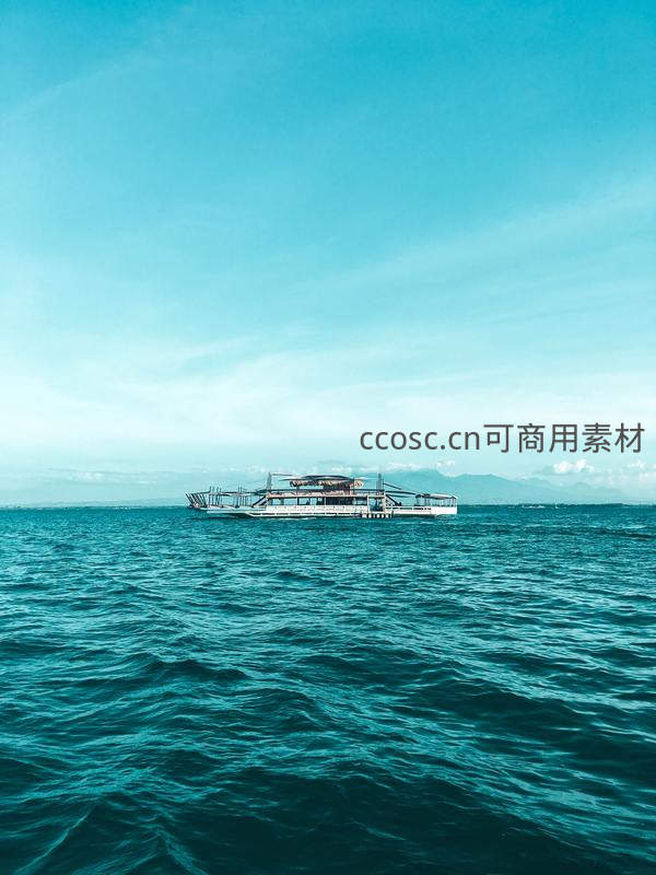 一艘双体游轮静静航行在无垠的碧蓝海面上,头顶是清澈的浅蓝色天空,远处隐约可见山峦轮廓。画面传达出广阔、宁静与探索未知的自由感。