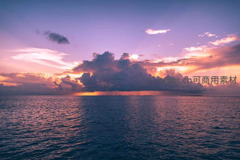 平静的海面反射着绚丽的晚霞,紫色与橙色交融于天际线,远处云团如画,营造出静谧而梦幻的海滨黄昏氛围。