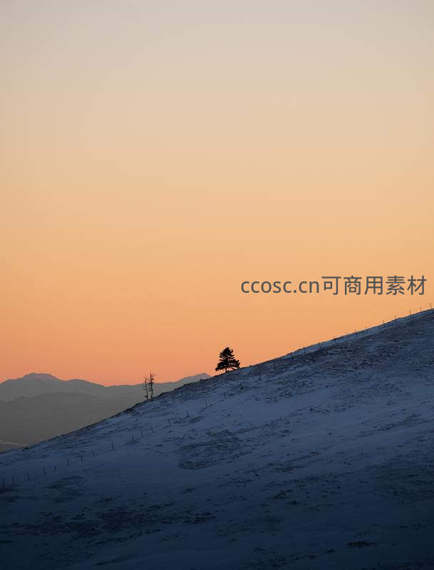 覆雪的山坡上一棵孤松伫立,橙粉渐变的天空温柔笼罩远山,画面简洁而富有诗意,传递冬日黄昏的静谧之美。