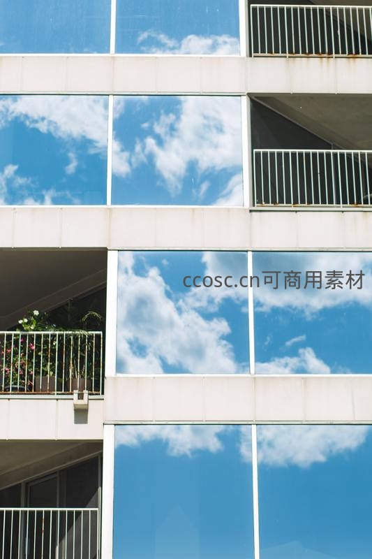 现代建筑玻璃幕墙倒映蓝天白云