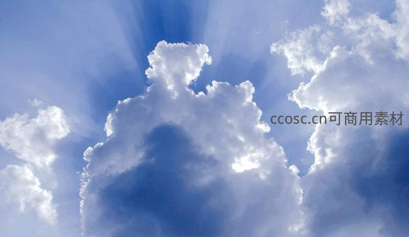 蓬松洁白的云层在蔚蓝天空中翻涌,金色阳光穿透云隙洒下神圣光柱,营造出宁静而壮丽的天空奇观。