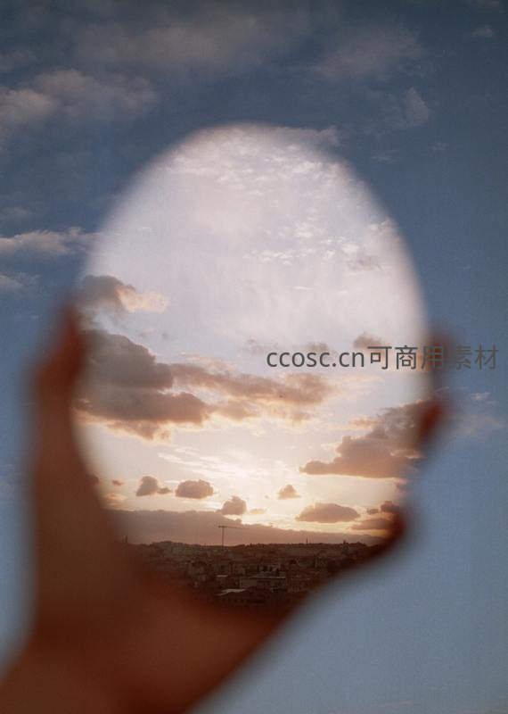 手掌轻托圆形镜面,巧妙框住远方城市的黄昏天际线,云朵被染成暖色,赋予平凡景象以艺术构图之美。