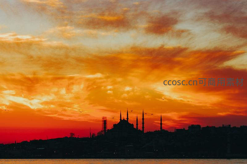 壮丽的晚霞如熔金般洒满天际,古老清真寺的轮廓在绚烂背景中化为深邃剪影,宁静而庄严。