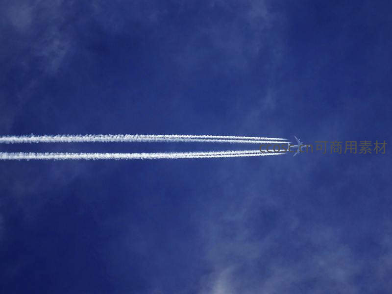 一架客机在湛蓝高空中飞行,身后拖曳着清晰笔直的白色航迹,如同琴弦划破寂静的天幕。