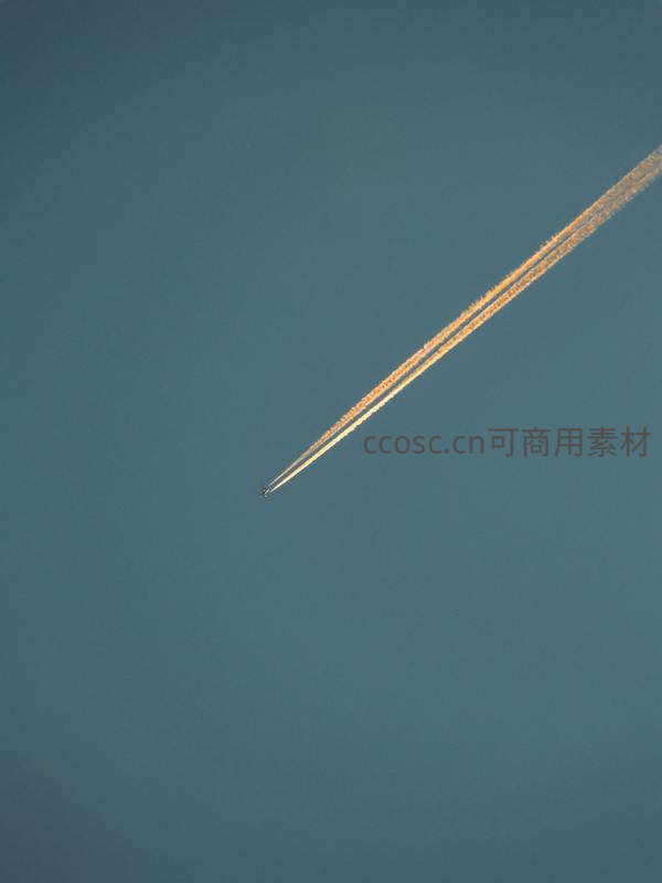 在暮色渐浓的天空下,一架飞机划过天际,其航迹被夕阳染成金色,象征着远行与无垠的自由。