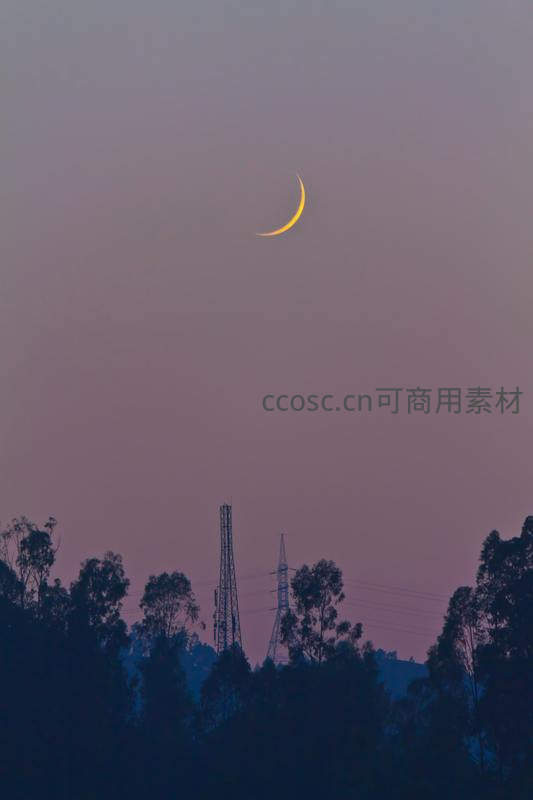 一弯金黄新月悬于紫灰暮色天幕,下方是深色树林与高耸电力塔的剪影,构成一幅静谧而富有工业与自然交融之美的画面。