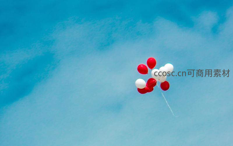 几只红白相间的气球轻盈地飘向无垠的湛蓝天空,象征着欢庆与希望,画面简洁明快,传递出轻松愉悦与对未来的美好憧憬。