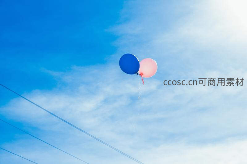 一对蓝粉相间的气球轻盈地飘浮在湛蓝的天空中,几缕纤细的电线划过画面,象征着童真、自由与对远方的向往。