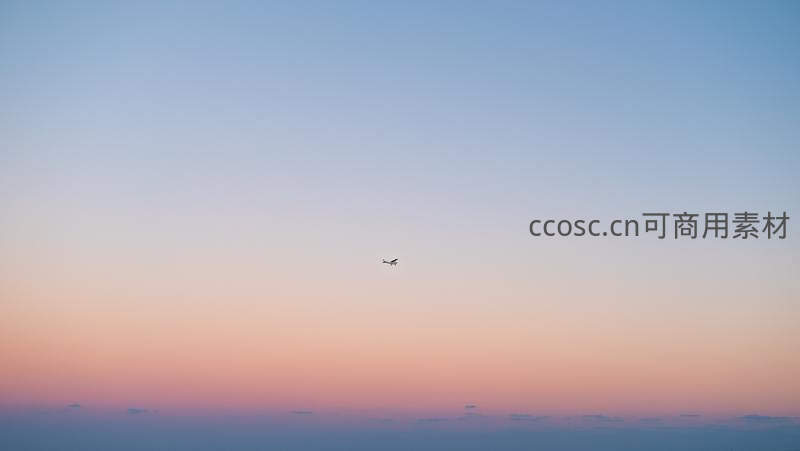一架飞机独自飞越粉蓝渐变的黄昏天际,渺小身影承载着远行梦想,画面静谧而富有诗意。