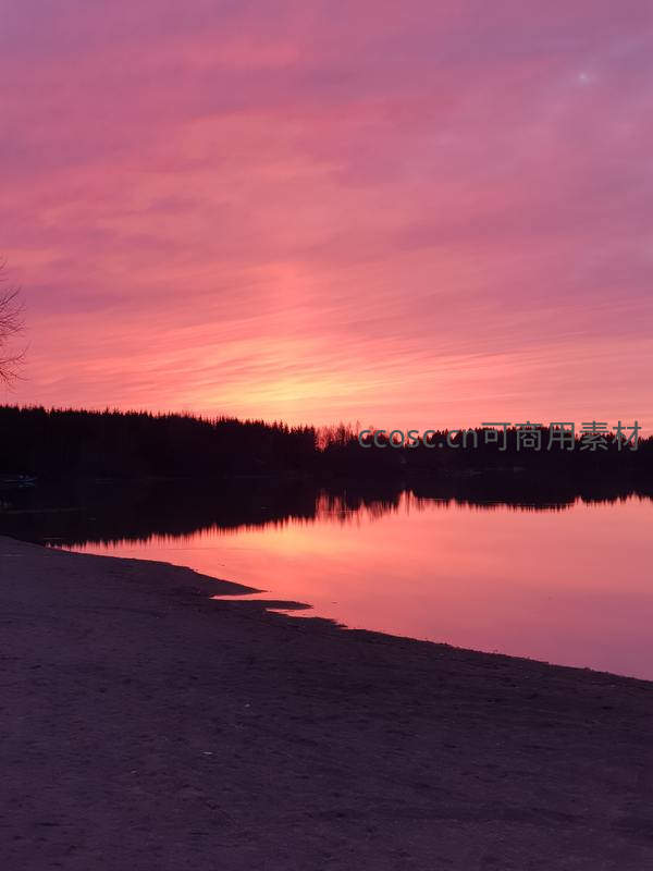 粉紫色晚霞铺满天际,平静湖面完美倒映绚烂色彩,岸边沙地延伸至远方,构成一幅温柔静谧的湖畔黄昏画卷。