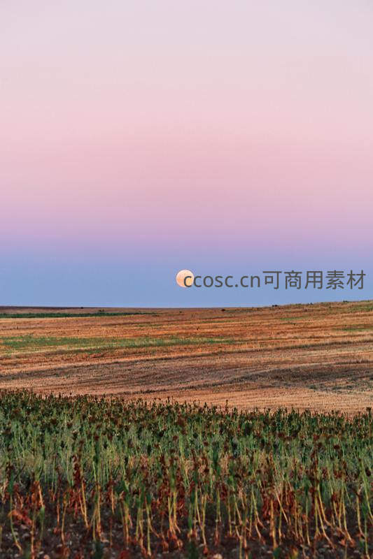 一轮明月从收割后的田野地平线上缓缓升起,柔和的光晕洒满大地,展现出秋收后乡村夜晚的宁静与祥和。
