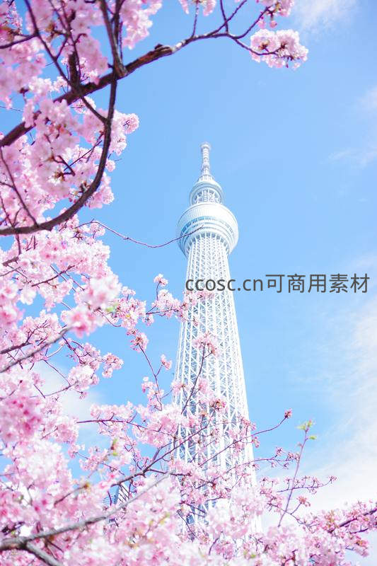 粉嫩的樱花枝头在湛蓝天空下绽放,背景是高耸入云的东京塔,现代建筑与自然春色完美融合,充满生机与活力。