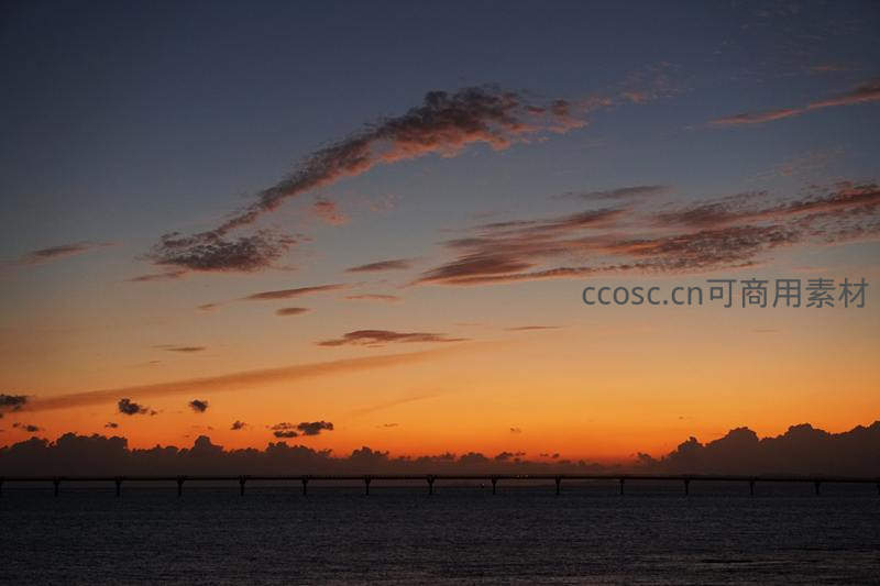 夕阳西下,天空被染成一片温暖的橙红色,云朵如火焰般燃烧,远处的桥梁横跨海面,构成一幅壮丽而宁静的黄昏画卷。