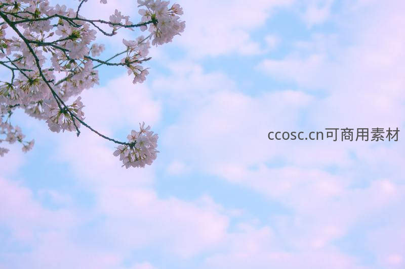 一枝盛开的粉白色樱花伸向湛蓝的天空,朵朵花瓣娇嫩欲滴,背景是轻柔飘动的白云,整个画面充满了春日的清新与浪漫气息。
