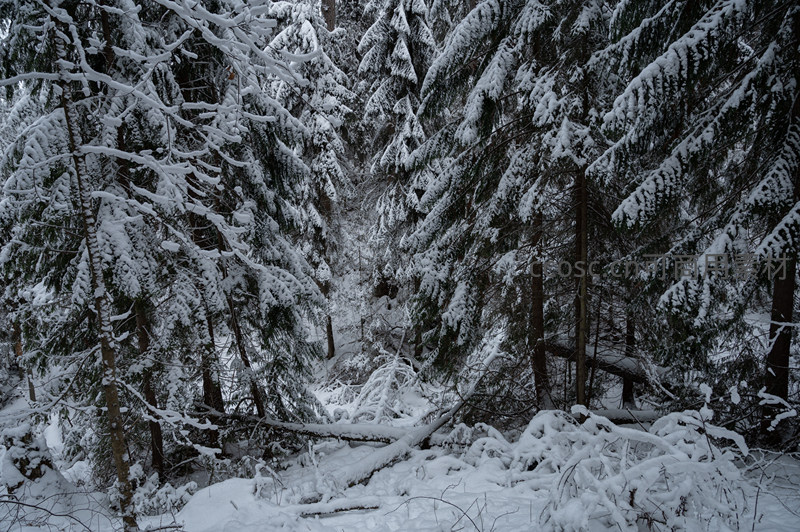 被厚厚积雪覆盖的森林小径蜿蜒向前,四周高耸的松树挂满雪花,整个场景透着一种与世隔绝的宁静与神秘感。