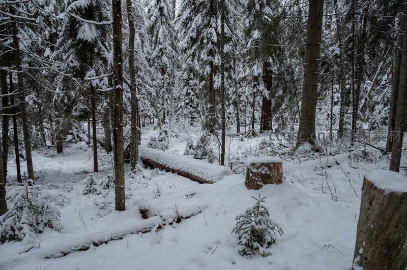 白雪覆盖的针叶林中,树干挺拔,地面与倒木皆被厚雪包裹,营造出一片寂静而纯净的冬日秘境。