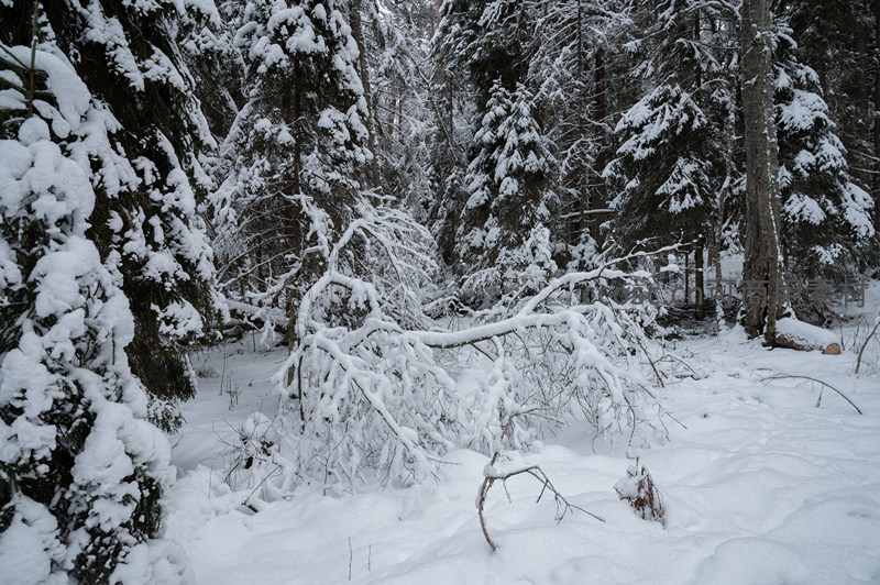 雪压枝头的森林角落