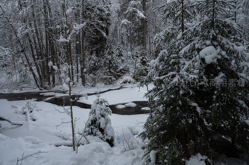 雪后的森林里,小径被白雪覆盖,溪流在雪地中穿行,两旁是挂满积雪的树木。整个场景宁静而优美,宛如童话世界中的冬日仙境。