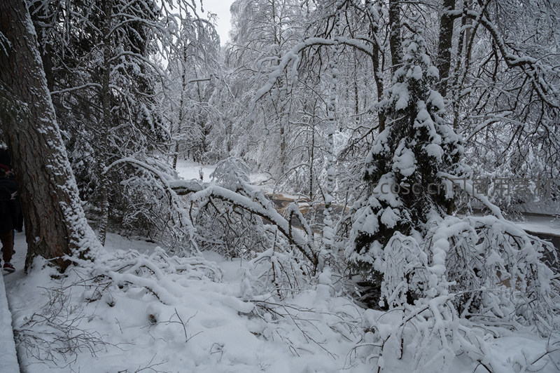 粗壮的树干和低垂的枝桠上堆满了蓬松的积雪,远处隐约可见溪流。雪后森林显得格外沉静,每一处细节都散发着浓郁的冬日气息。
