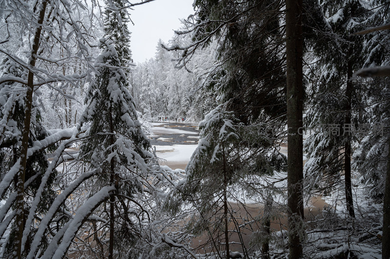 透过被雪压弯的松枝望去,一条小径延伸至远方,几位游客点缀其间,为这片寂静的雪林增添了一丝生气。