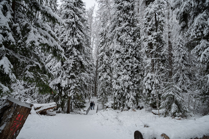 皑皑白雪覆盖着茂密的松树林,一条蜿蜒小径通向远方,几位游客正缓步前行,享受冬日静谧。