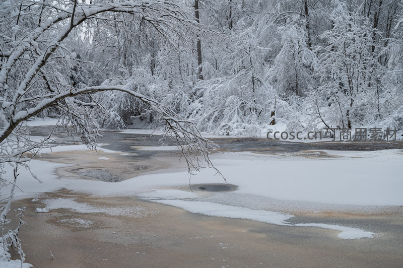 半结冰的河流静静流淌于雪林之间,枯枝挂满霜雪低垂水面,倒影朦胧,展现冬日水岸的独特美感。