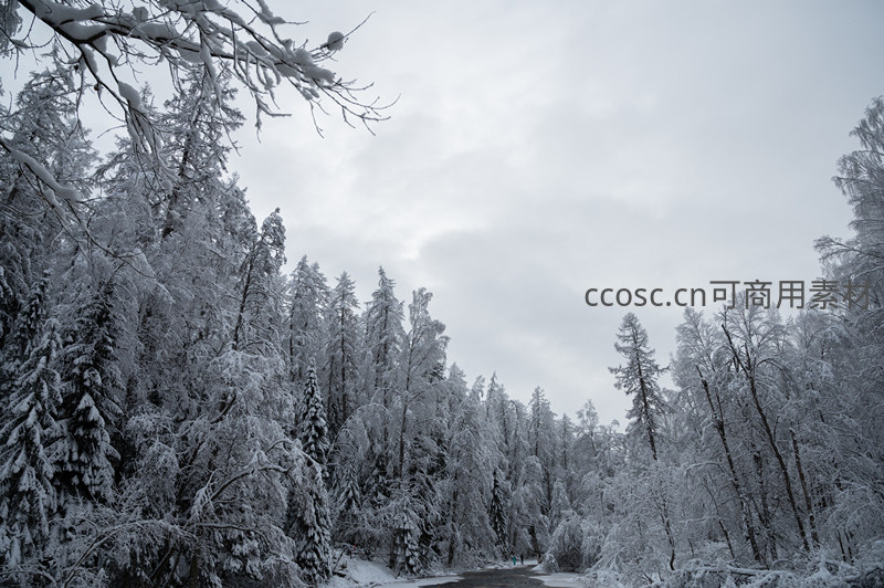 皑皑白雪覆盖着茂密的针叶林,一条蜿蜒的小路穿行其间,天空阴沉,营造出一种纯净而宁静的冬日氛围。