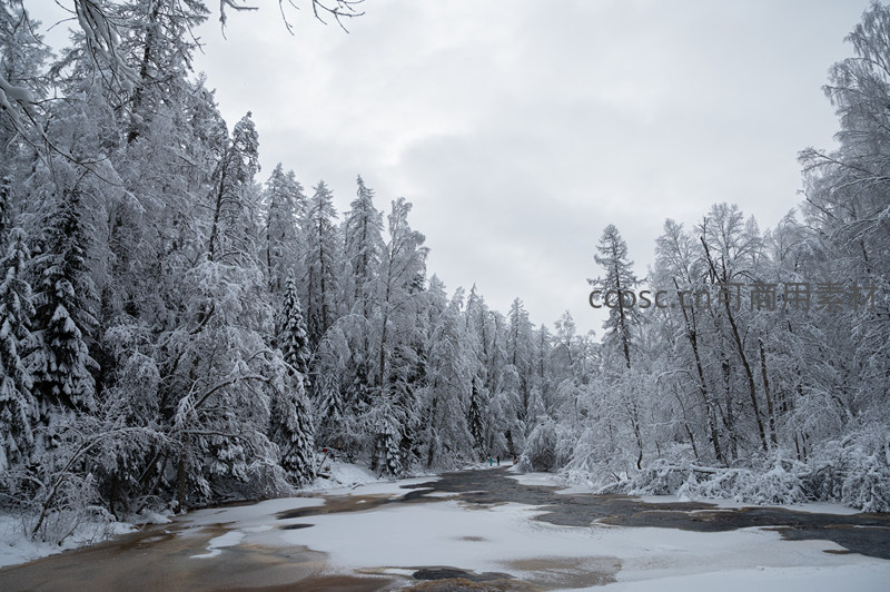部分结冰的河流蜿蜒穿过被厚厚积雪覆盖的森林,远处隐约可见行人,展现了冬日里自然与人类活动交织的独特景象。