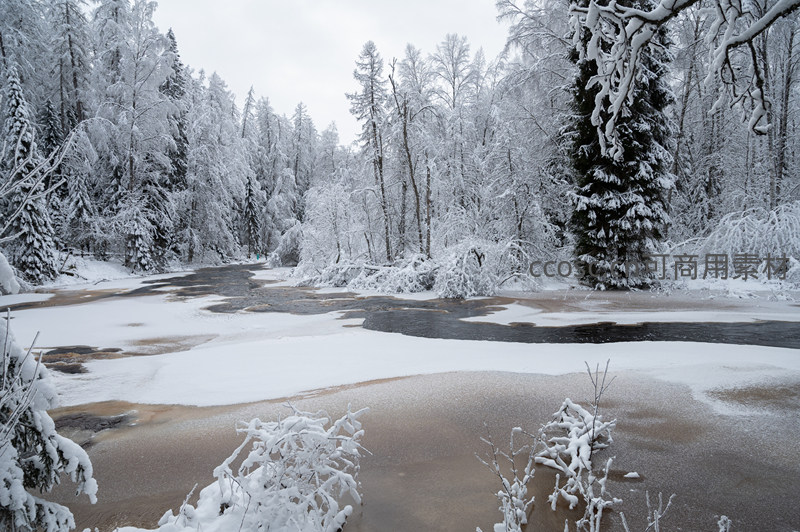 雪覆森林溪流静谧冬日画卷
