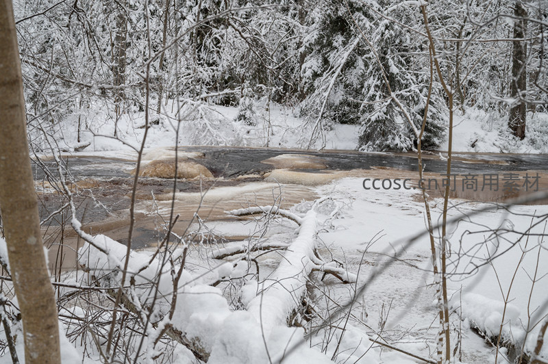 透过稀疏的枯枝望去,雪中的溪流缓缓流动,岸边倒伏的树干与飘落的雪花相映成趣,构成了一幅充满诗意与野趣的冬日森林图景。