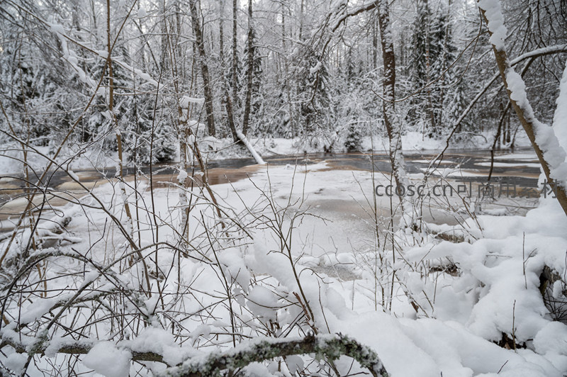 白雪覆盖的森林中,一条小溪蜿蜒流淌,部分水面结冰,枝头挂满积雪,营造出宁静而纯净的冬日氛围。