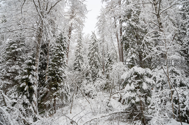 皑皑白雪覆盖着茂密的针叶林与阔叶树,枝头挂满冰晶,阳光透过树隙洒下斑驳光影,营造出童话般的静谧氛围。