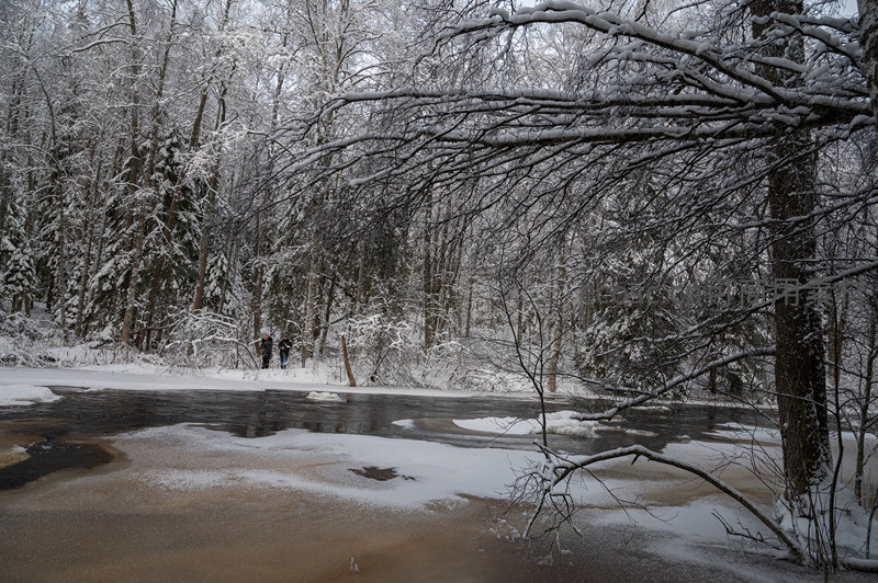 在结冰的河面上,几位游客踏雪前行,四周是银装素裹的树林,阳光透过枝叶洒下斑驳光影,充满冬日探索的乐趣。