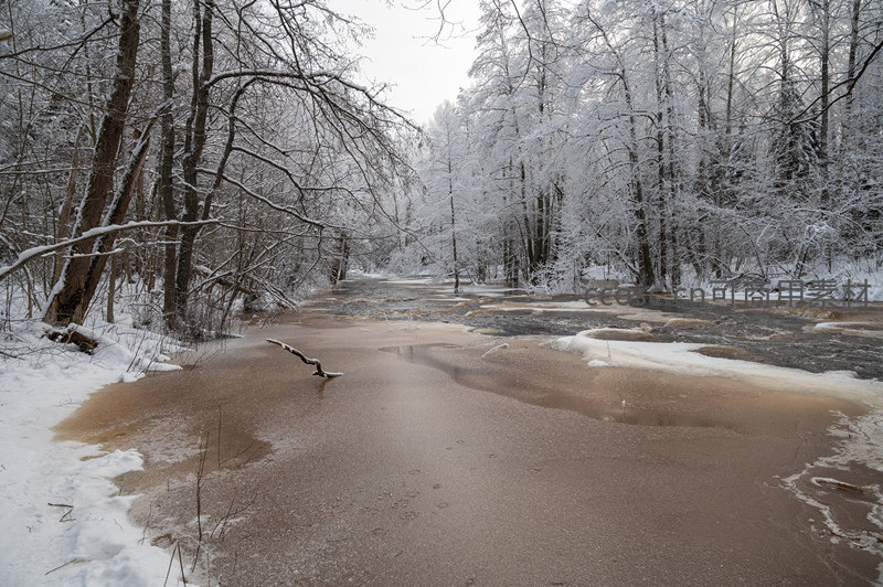 冬日森林深处,溪水在雪地中缓缓流淌,两岸树木枝干披雪,倒影映于水面,构成一幅安详、素雅且充满诗意的北国冬日图景。