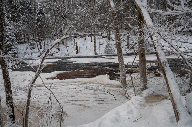 透过覆雪的树枝望去,溪流在林间蜿蜒,冰与水交界处形成独特纹理,雪地与暗色流水对比鲜明,宛如一幅天然水墨冬景画卷。