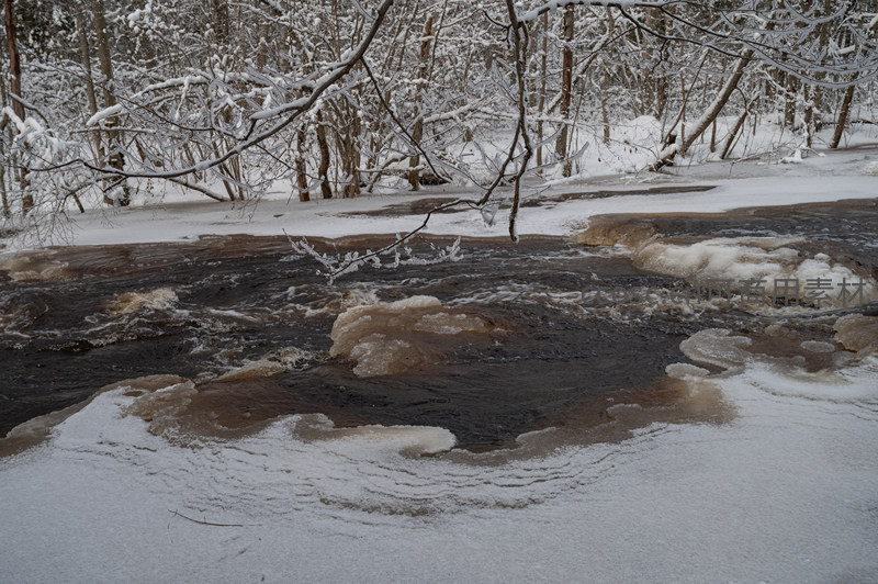 湍急的溪流在冰雪覆盖的河床中奔涌,两岸白雪皑皑,水流与冰层形成鲜明对比,展现冬日自然的力量与美感。