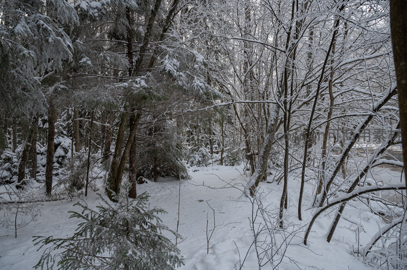 一条被雪覆盖的小径蜿蜒穿过密林深处,四周树木披雪,空气清冷,仿佛通往无人之境,尽显冬日森林的孤寂之美。
