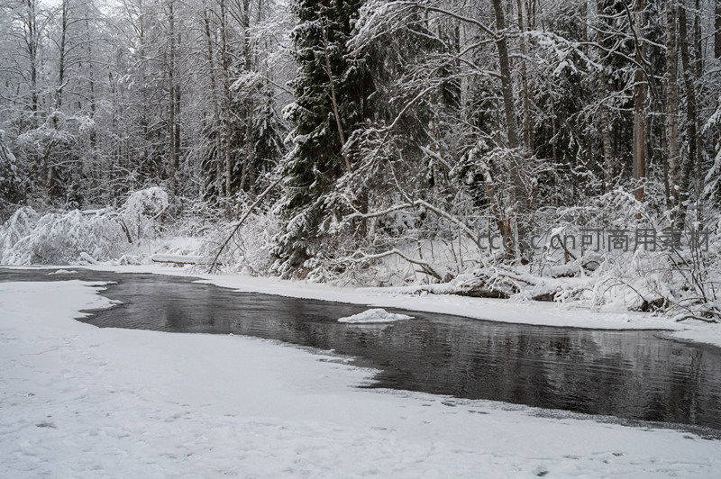 被厚厚积雪覆盖的林间小径旁,一条细长的溪流静静流淌,部分水面已结薄冰,四周高耸的松树披着银装,构成一幅诗意盎然的冬季风景画。