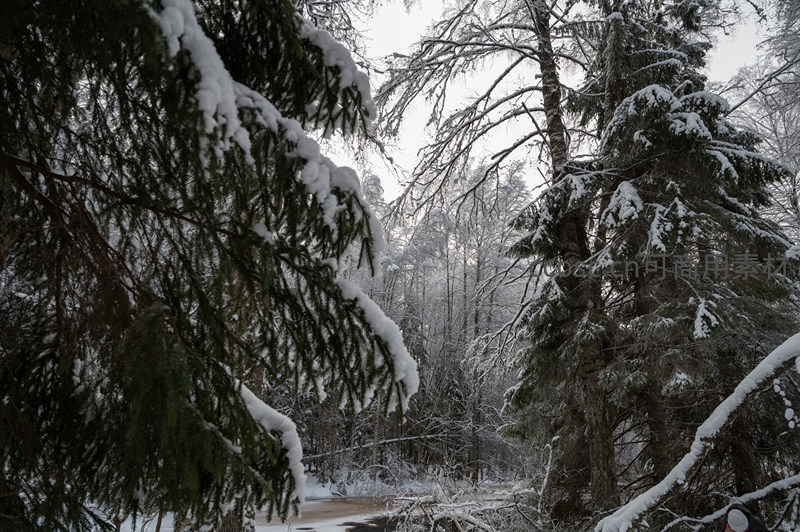 雪后的森林深处,溪水在冰封边缘缓缓流动,水面微微荡漾,映照着周围被雪覆盖的松树与枯枝,整个画面宁静而富有层次感。