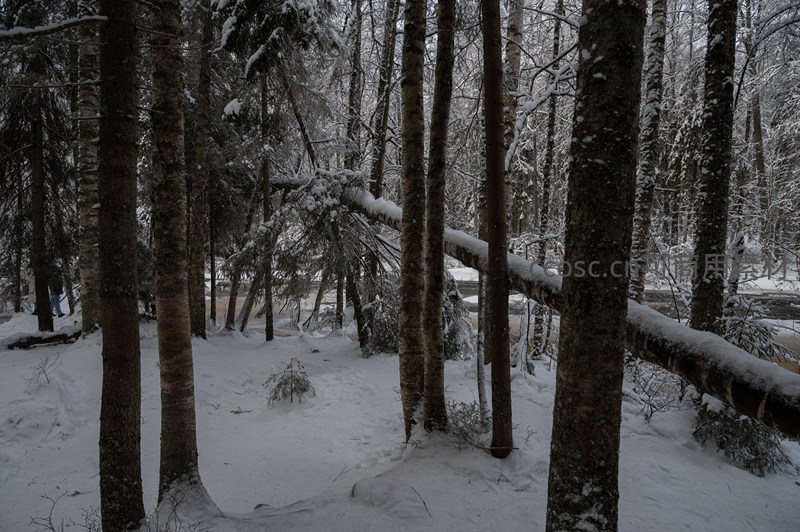 高大笔直的树干在雪地中形成天然通道,一根横卧的雪覆倒木斜倚其间,光影交错,营造出神秘而深邃的冬季森林意境。
