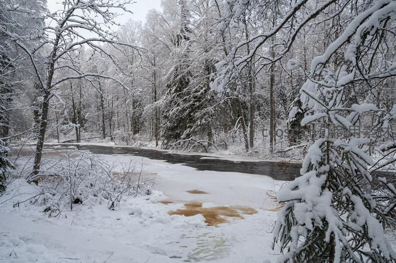阳光洒在雪覆的林间小径上,溪水缓缓流动,部分河面已融化,与周围的雪白世界形成对比,展现冬末春初的微妙生机。