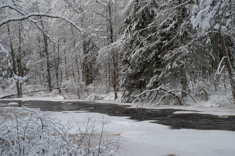 厚重的积雪压弯了树枝,溪流在雪野中曲折前行,未完全冻结的水面泛起微波,为这片寂静的雪林增添了一丝灵动与活力。