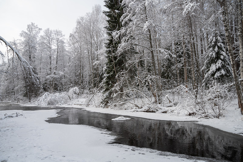 清澈的溪水如镜面般倒映着雪覆的树木,岸边积雪洁白无瑕,水天相接处朦胧一片,仿佛置身于童话般的冰雪世界之中。