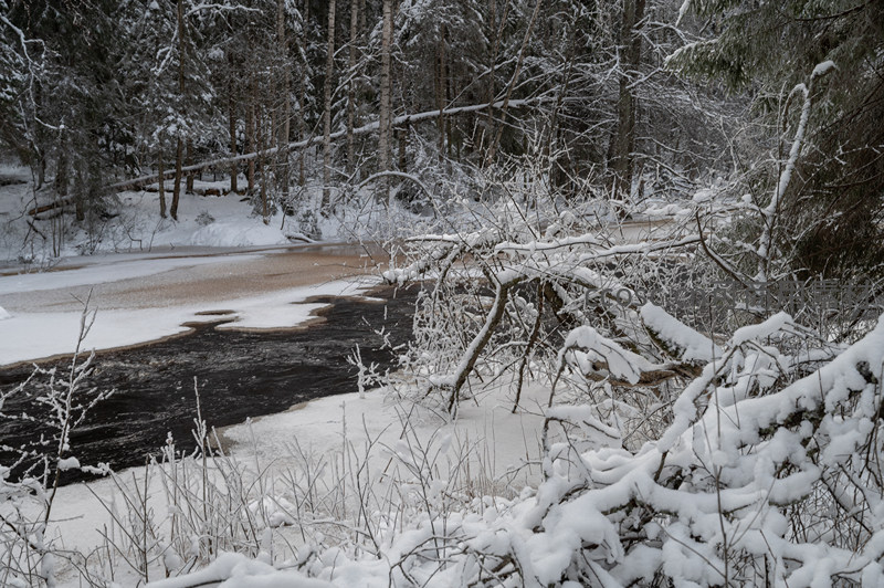 蜿蜒的溪流穿过被白雪覆盖的森林,部分水面未结冰,与周围雪白世界形成对比,展现出冬日林间独特的幽静与生机。