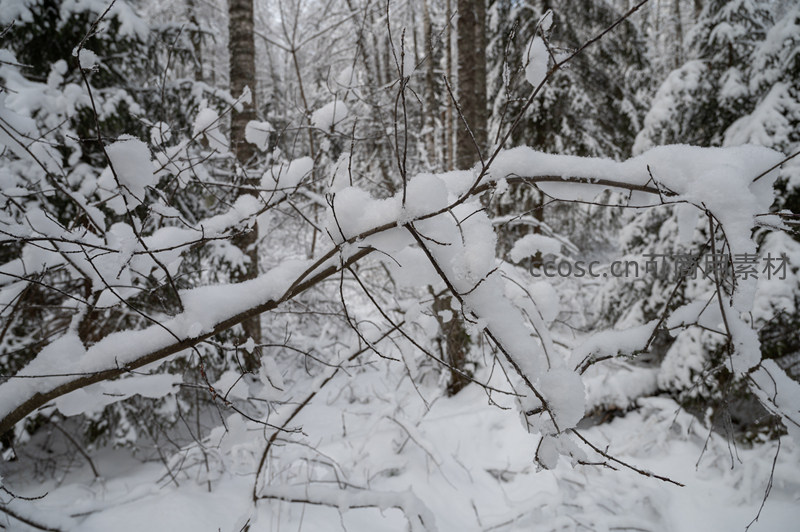 镜头聚焦于覆满厚雪的细枝,雪层蓬松洁白,枝条轮廓分明,微距视角下宛如天然玉雕,展现冬日自然的精致之美。