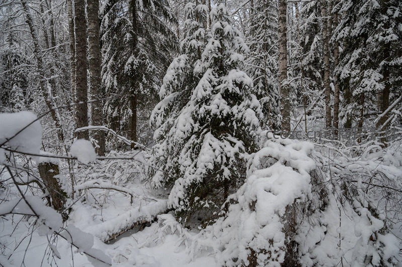 厚厚的积雪压弯了松柏的枝桠,深绿的针叶在白雪映衬下更显苍劲,林间光影交错,呈现一幅静谧而富有生命力的冬日画卷。