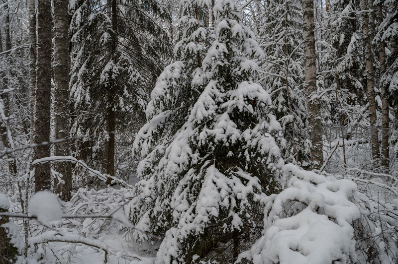皑皑白雪覆盖着茂密的松树林,枝头挂满积雪,地面铺就纯白地毯,营造出一片寂静祥和的冬日仙境。